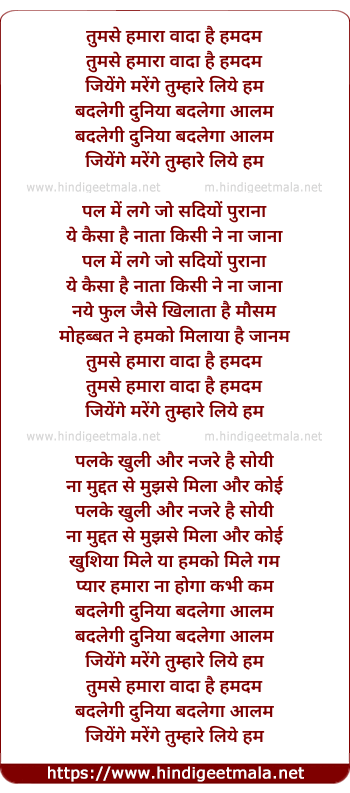Lyrics of Tujhase Hamaaraa Vaadaa Hai Hamadam - तुमसे हमारा वादा है हमदम