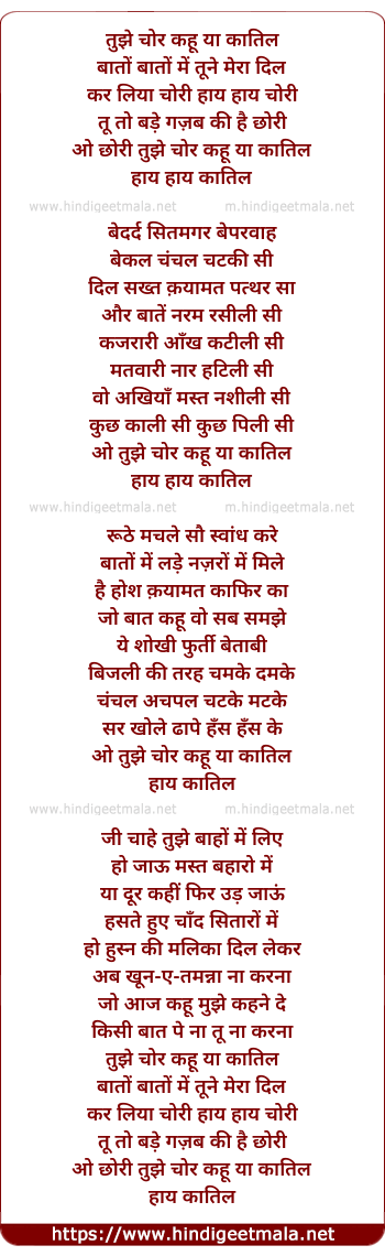 Lyrics of Tujhe Chor Kahu Ya Qatil - तुझे चोर कहू या कातिल