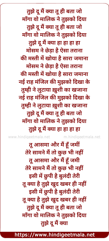 Lyrics of Tujhe Du Mai Kya Tu Hi Bata - तुझे दू मैं क्या तू ही बता
