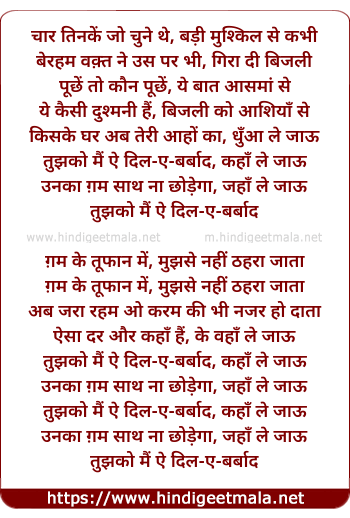 Lyrics of Tujhko Mai Ye Dile Barbad (Version 2) - चार तिनकें जो चुने थे, बड़ी मुश्किल से कभी