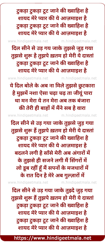 Lyrics of Tukda Tukda Toot Jane Ki Khwaish Hai - टुकड़ा टुकड़ा टूट जाने की ख्वाहिश है