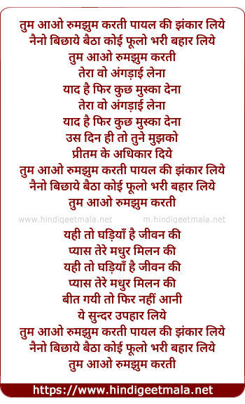 Lyrics of Tum Aao Rumjhum Karti - तुम आओ रुमझुम करती पायल की झंकार लिये