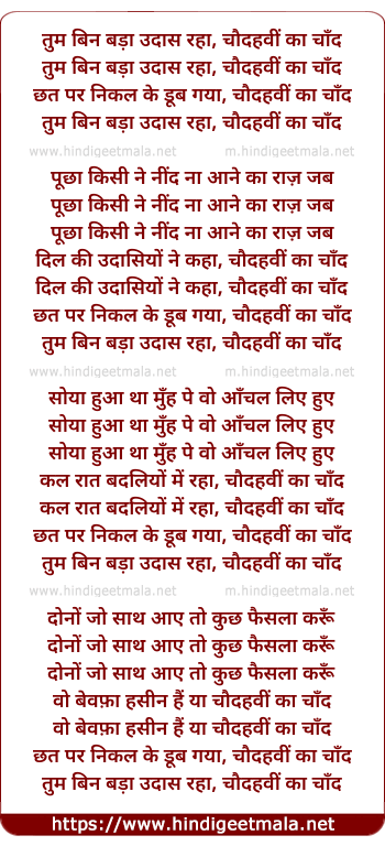 Lyrics of Tum Bin Bada Udaas Raha Chaudvin Ka Chand - तुम बिन बड़ा उदास रहा, चौदहवीं का चाँद