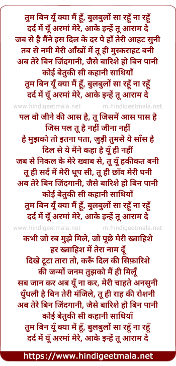 tum bin yu kya main hu, bulbulo sa rahu naa rahu