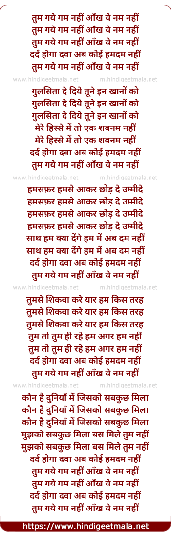 Lyrics of Tum Gaye Gam Nahi Aankh Ye Nam Nahi - तुम गये गम नहीं आँख ये नम नहीं