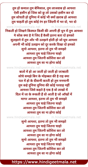 Lyrics of Tum Ho Kamaal, Tum Bemisaal, Suno Aisha - तुम हो कमाल तुम बेमिसाल, सुनों आयशा