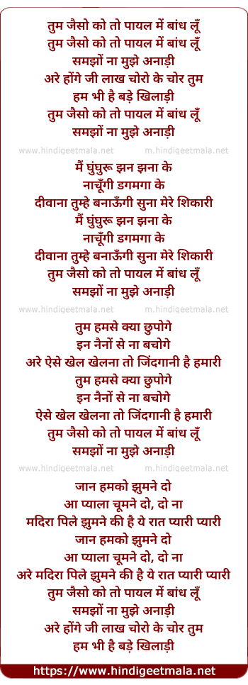 Lyrics of Tum Jaiso Ko To Payal Me Baand Lu - तुम जैसो को तो पायल में बांध लूँ