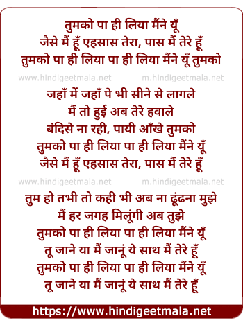 Lyrics of Tum Ko Paa Hi Liya - तुमको पा ही लिया