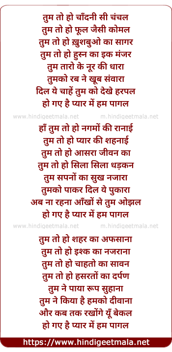 Lyrics of Tum To Ho Chandni Se Chanchal - तुम तो हो चाँदनी सी चंचल