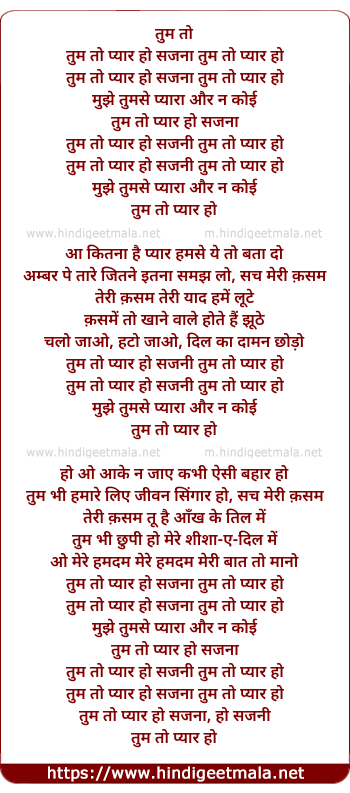 Lyrics of Tum To Pyar Ho Sajni, Mujhe Tumse Pyara Aur Na Koyi - तुम तो प्यार हो सजनी, मुझे तुमसे प्यारा और न कोई