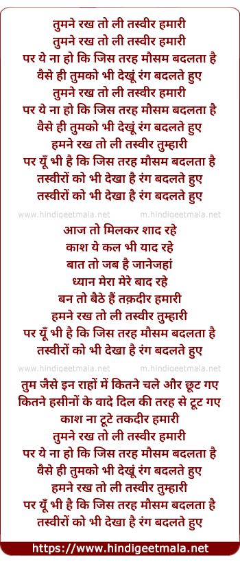 Lyrics of Tumane Rakh To Lee Tasvir Hamari - तुमने रख तो ली तस्वीर हमारी