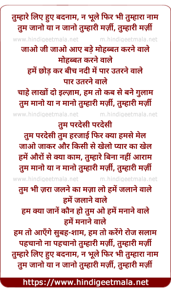 Lyrics of Tumhare Liye Hue Badnam, Na Bhule Fir Bhi Tumhara Nam - तुम्हारे लिए हुए बदनाम, ना भूले फिर भी तुम्हारा नाम
