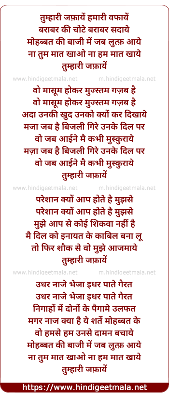 Lyrics of Tumhari Jafayein Hamari Wafayen - तुम्हारी जफ़ायें हमारी वफायें