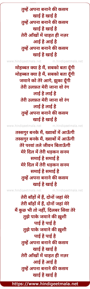 Lyrics of Tumhe Apna Banane Ki Kasam (Female) - तुम्हें अपना बनाने की कसम