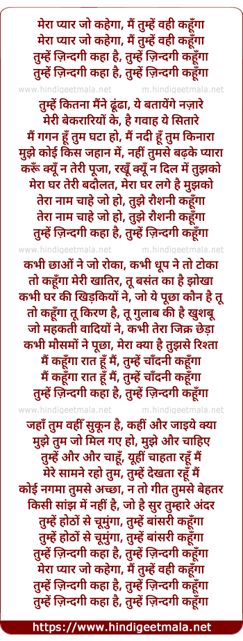 Lyrics of Tumhe Zindagi Kaha Hain - मेरा प्यार जो कहेगा, मैं तुम्हें वही कहूँगा
