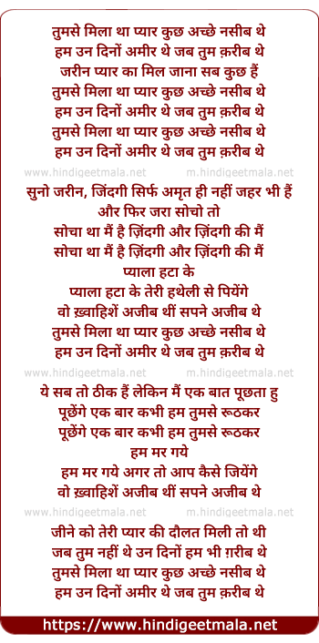 Lyrics of Tumse Mila Tha Pyar Kuchh Achche Nasib The - तुमसे मिला था प्यार कुछ अच्छे नसीब थे