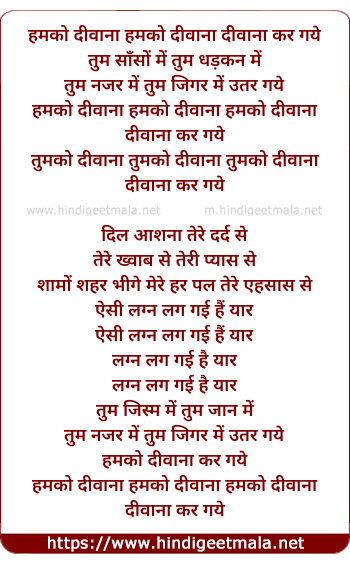 Film CastAkshay Kumar, Bipasha Basu, Katrina Kaif, Anil Kapoor, BhagyashreeSingerSonu Nigam, Tulsi Kumar, Himesh Reshammiya, Abhijeet Bhattacharya, Anu Malik, Sunidhi Chauhan, Alka Yagnik, Shaan, Krishna, Nandini Srikar, K KLyricistSameerMusic ByAnu Malik, Himesh ReshammiyaDirectorRaj KanwarProducerRaj Kanwar, Bhushan Kumar, Krishan KumarExternal LinksHumko Deewana Kar Gaye at IMDB Humko Deewana Kar Gaye at WikipediaYouTubeHumko Deewana Kar Gaye at YT Humko Deewana Kar Gaye at YT(2)