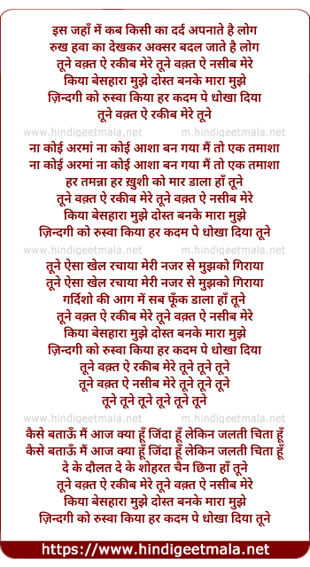 Lyrics of Tune Waqt Hey Raqeeb Mere - तूने वक़्त ऐ रकीब मेरे