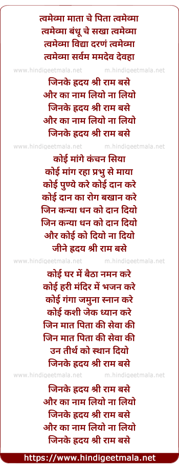 Lyrics of Tvamevma Mata Jinke Hriday Shriram - त्वमेव्मा माता जिनके ह्रदय श्री राम