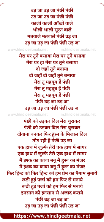 Lyrics of Udd Jaa Panchi Udd Jaa - उड़ जा उड़ जा पंछी पंछी