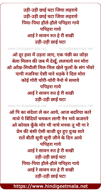 Lyrics of Uudi Uudi Chhaai Ghataa Jiyaa Laharaaye - उड़ी-उड़ी छाई घटा जिया लहराये