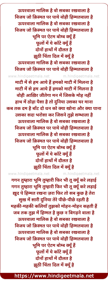 Lyrics of Uuparavaalaa Maalik Hai Vo Sabakaa Rakhavaalaa Hai - ऊपरवाला मालिक है वो सबका रखवाला है