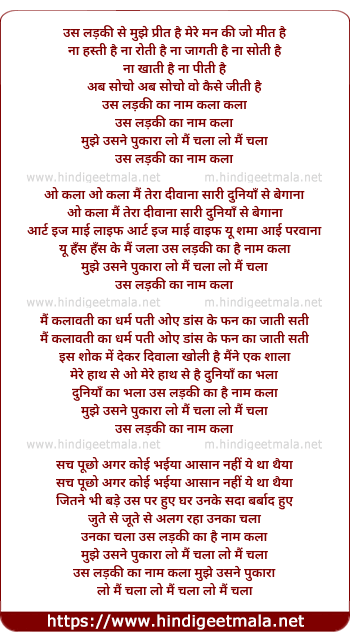 Lyrics of Us Ladki Ka Hai Naam Kala - उस लड़की का नाम कला