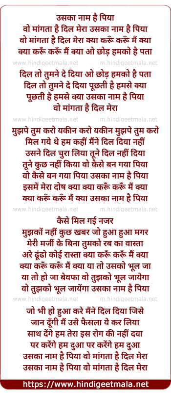 Lyrics of Uska Naam Hai Piya - उसका नाम है पिया