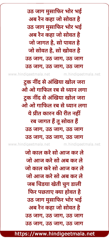 Lyrics of Uth Jaag Musafir Bhor Bhai - उठ जाग मुसाफिर भोर भई