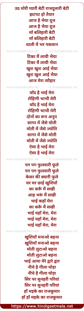 Lyrics of Uth Meri Pyari Beti - उठ मोरी प्यारी बेटी राजदुलारी बेटी
