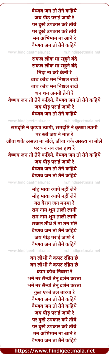 Lyrics of Vaishnav Jan To Tene Kahiye - वैष्णव जन तो तैने कहिये
