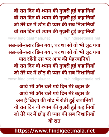 Lyrics of Vo Raat Din Vo Shaam Ki Guzari Hui Kahaniya - वो रात दिन वो श्याम की गुज़री हुई कहानियाँ
