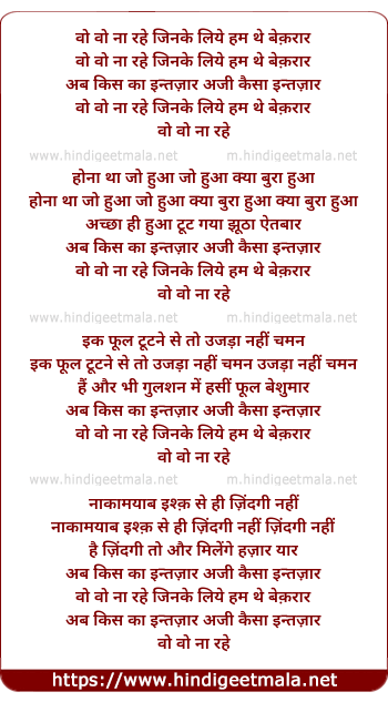 Lyrics of Vo Vo Naa Rahe Jinake Liye Ham The Beqaraar - वो वो ना रहे जिनके लिये हम थे बेक़रार