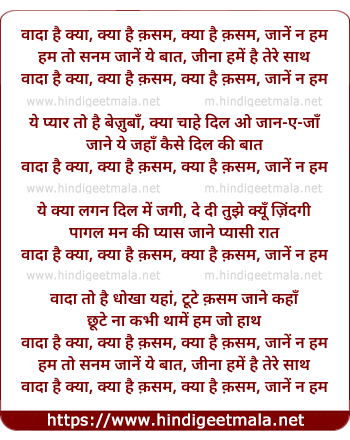 WADA HE KAIA ?KAIA HE QASAM?KAIA HE QASAM ?JANEY NA HAM?HAM TO SANAM JANE YE BAT?JEENA HAME HE TERE SATH...,YE PIYAR TO HE BE ZUBAN,KAIA CHAHE DIL O JAN E JAN,JAN E YE JAHAN KESE DIL KI BAT,YE KAIA LAGAN DIL ME JAGI,DE DI KIUN TUJHE ZINDAGI,PAGHAL MAN KI PIYAS JANE PIYASI RAT,WADA TO HE DHOKA YAHAN,TOOTE QASAM JANE KAHAN,CHOOTE NA KABHI THAME HAM JO HATH,