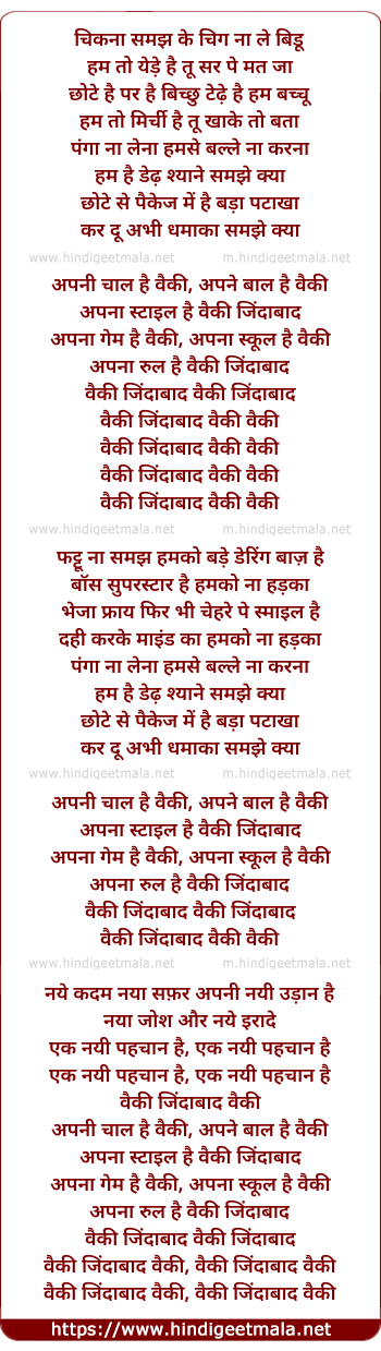 Lyrics of Whacky Zindabad, Apni Chaal Hai Whacky - वैकी जिंदाबाद, अपनी चाल है वैकी