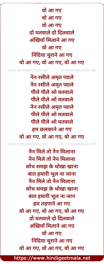 Lyrics of Wo Aa Gaye Do Matwale Do Dilwale - वो आ गए दो मतवाले दो दिलवाले