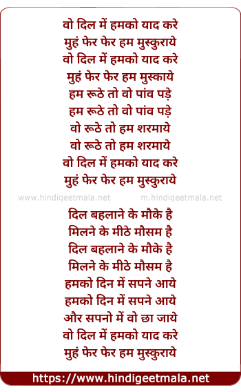 Lyrics of Wo Dil Me Humko Yaad Kare - वो दिल में हमको याद करे