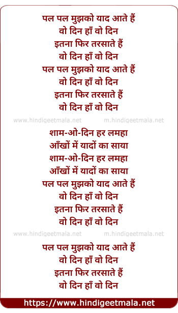 Lyrics of Wo Din - पल पल मुझको याद आते हैं