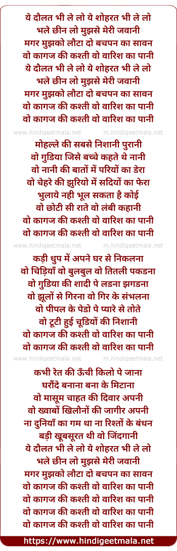 Lyrics of Wo Kaghaz Ki Kashti Wo Barish Ka Pani - वो कागज की कश्ती वो बारिश का पानी