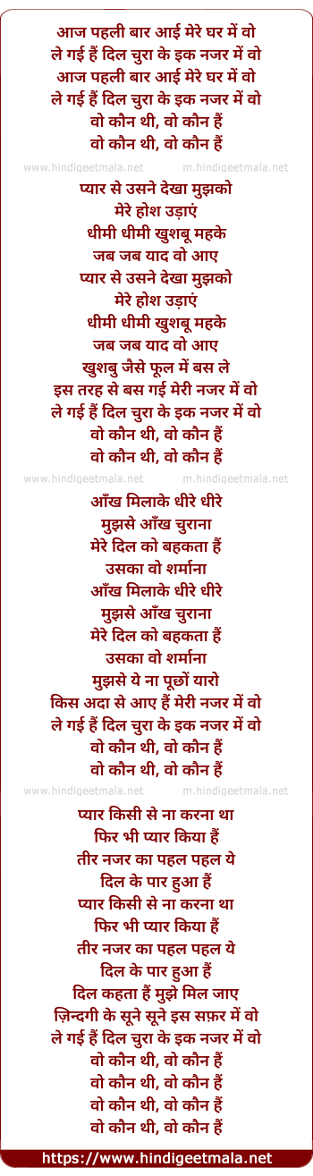 Lyrics of Wo Kaun Thi - आज पहली बार आई मेरे घर में वो