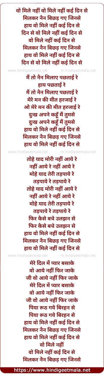 Lyrics of Wo Mile Nahi Kayi Din Se - वो मिले नहीं कई दिन से