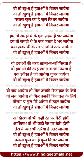 Lyrics of Wo To Kushbu Hai Hawaaon Men Bikhar Jaayegaa - वो तो ख़ुश्बू है हवाओं में बिखर जायेगा