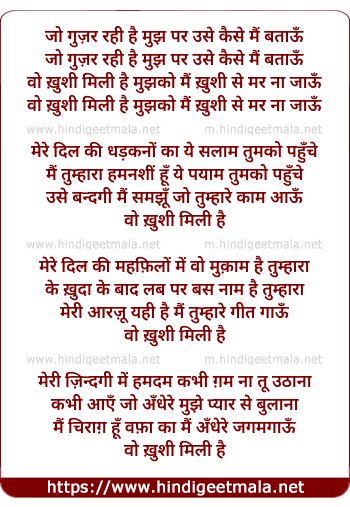 Lyrics of Wo Khushi Mili Hai Mujhko, Main Khushi Se Mar Na Jau - वो ख़ुशी मिली है मुझको, मैं ख़ुशी से मर ना जाऊँ