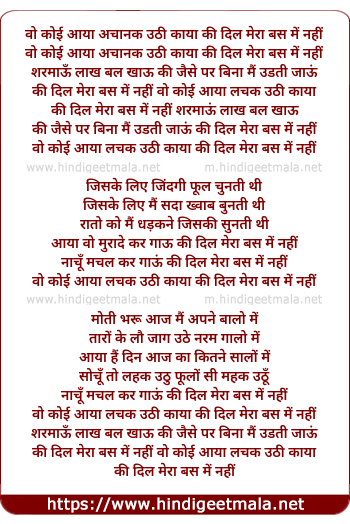 Lyrics of Woh Koi Aaya Lachak Uthi Kaya Ke Dil Mera Bas Me Nahi, Sarmau Na Aakh Balkhau - वो कोई आया अचानक उठी काया की दिल मेरा बस में नहीं