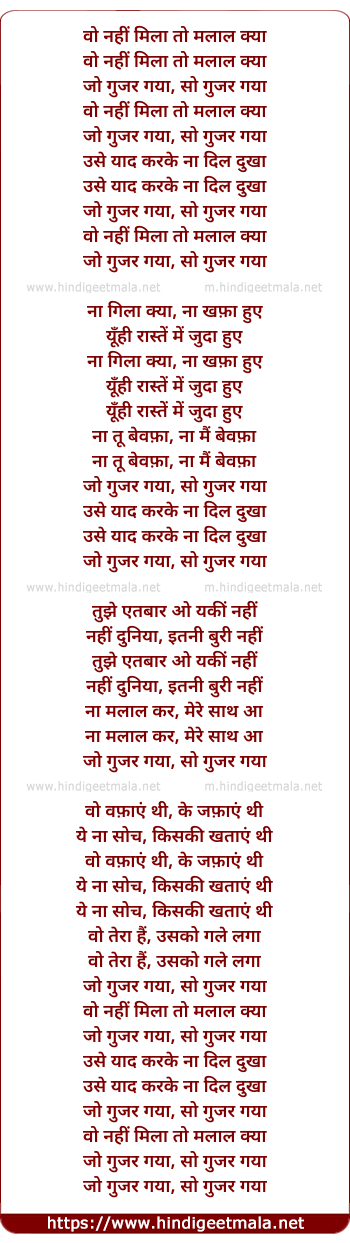 Lyrics of Woh Nahi Mila Toh Malaal Kya - वो नहीं मिला तो मलाल क्या