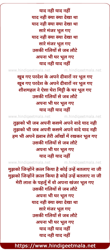 Lyrics of Yaad Nahi Kya Dekha Tha - याद नही याद नहीं