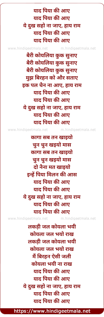 Lyrics of Yaad Piya Ki Aaye - याद पिया की आए