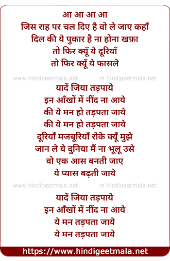 Lyrics of Yaade - आ आ आ आ