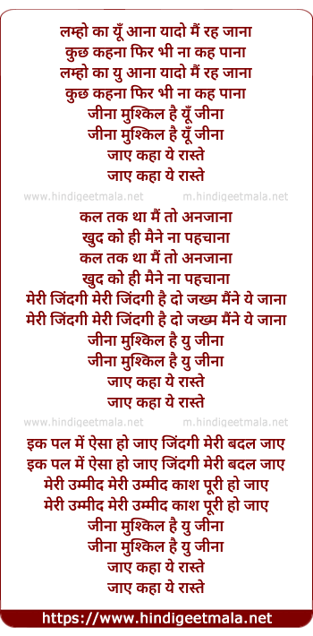 Lyrics of Yaadein... Jaaye Kahaan Yeh Raasta - यादें ..जाए कहा ये रास्ते
