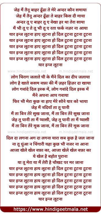 Lyrics of Yaar Aj Luttna Haye Luttna - यार अज लूटना हाय लूटना